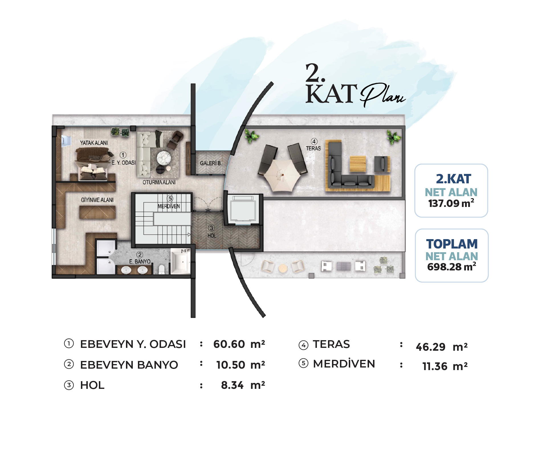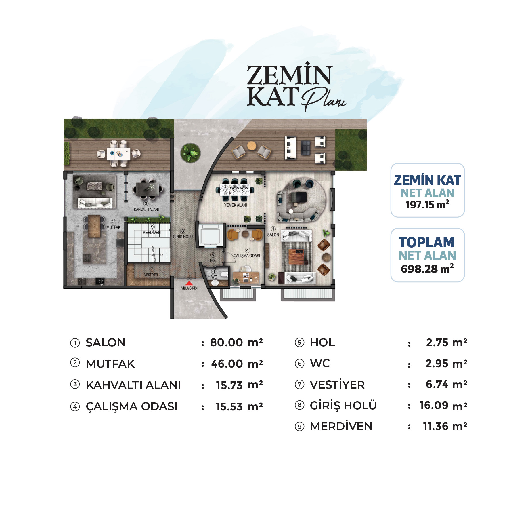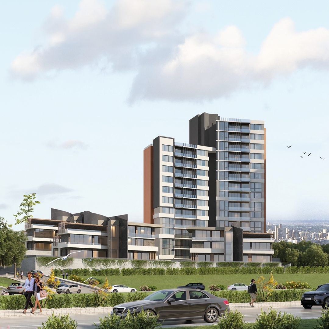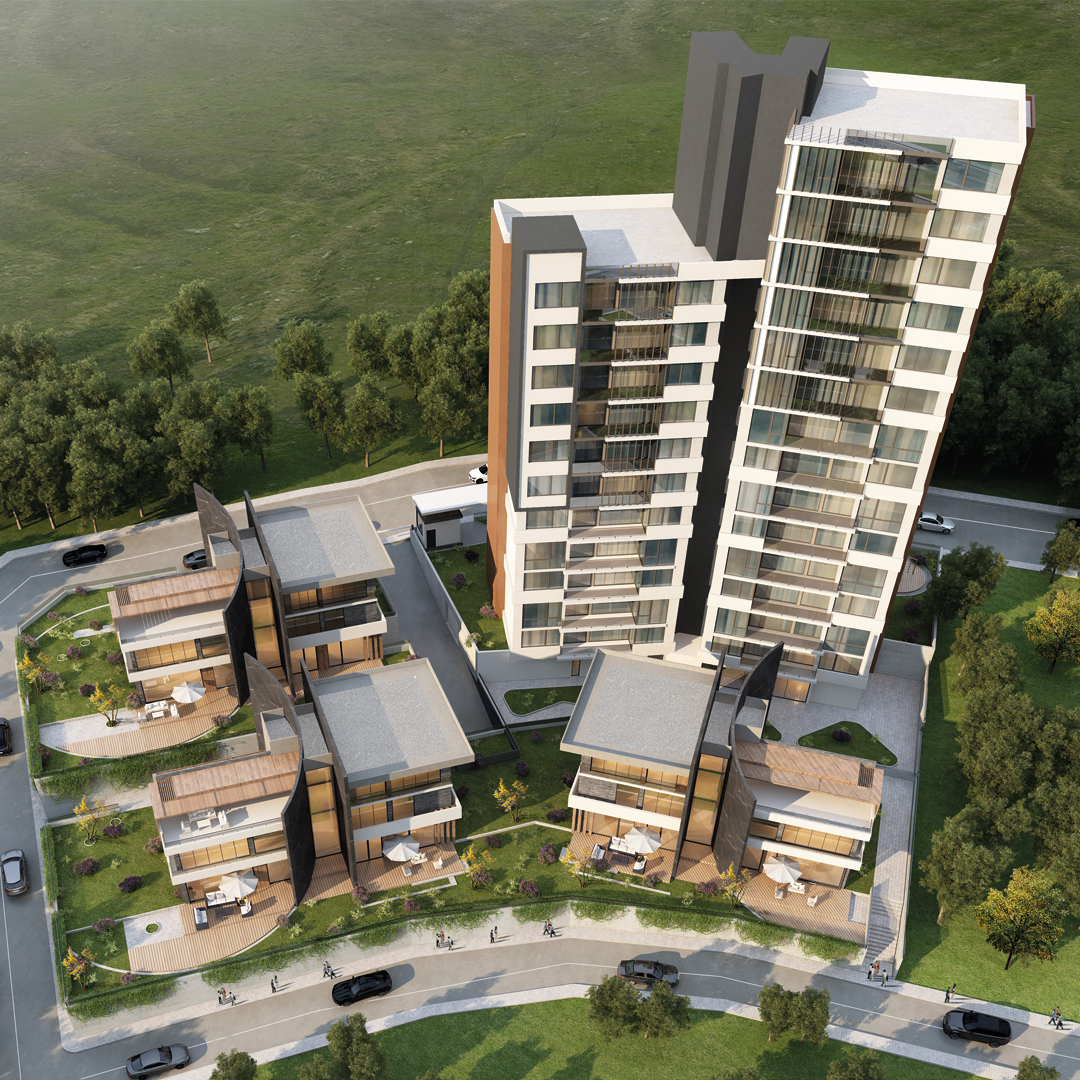 4 katlı ve asansörlü 3 adet villa kütlesinde ise lineer ve dairesel duvarlarla bölünerek, mimarisine farklı bir boyut kazandırılmıştır.