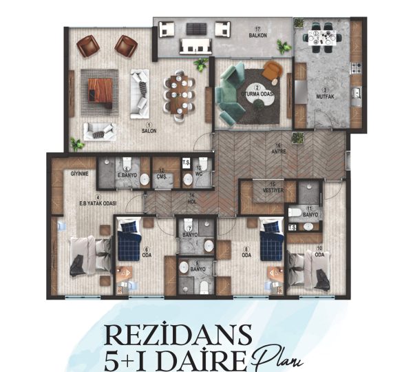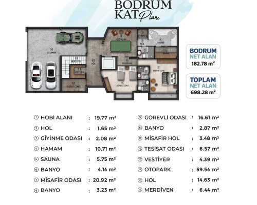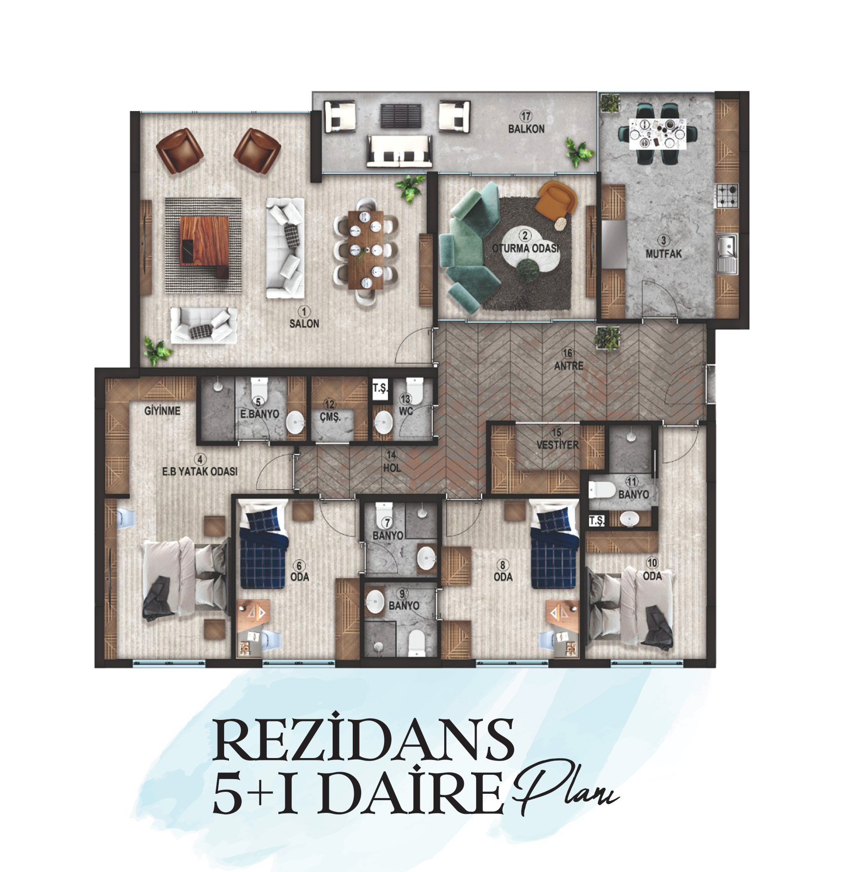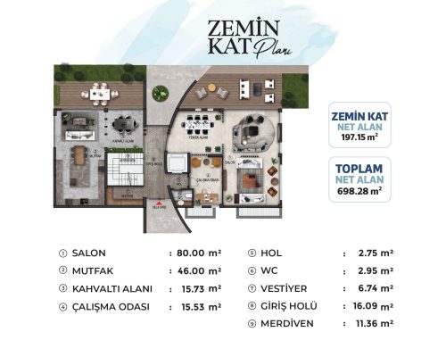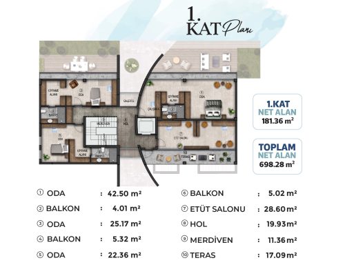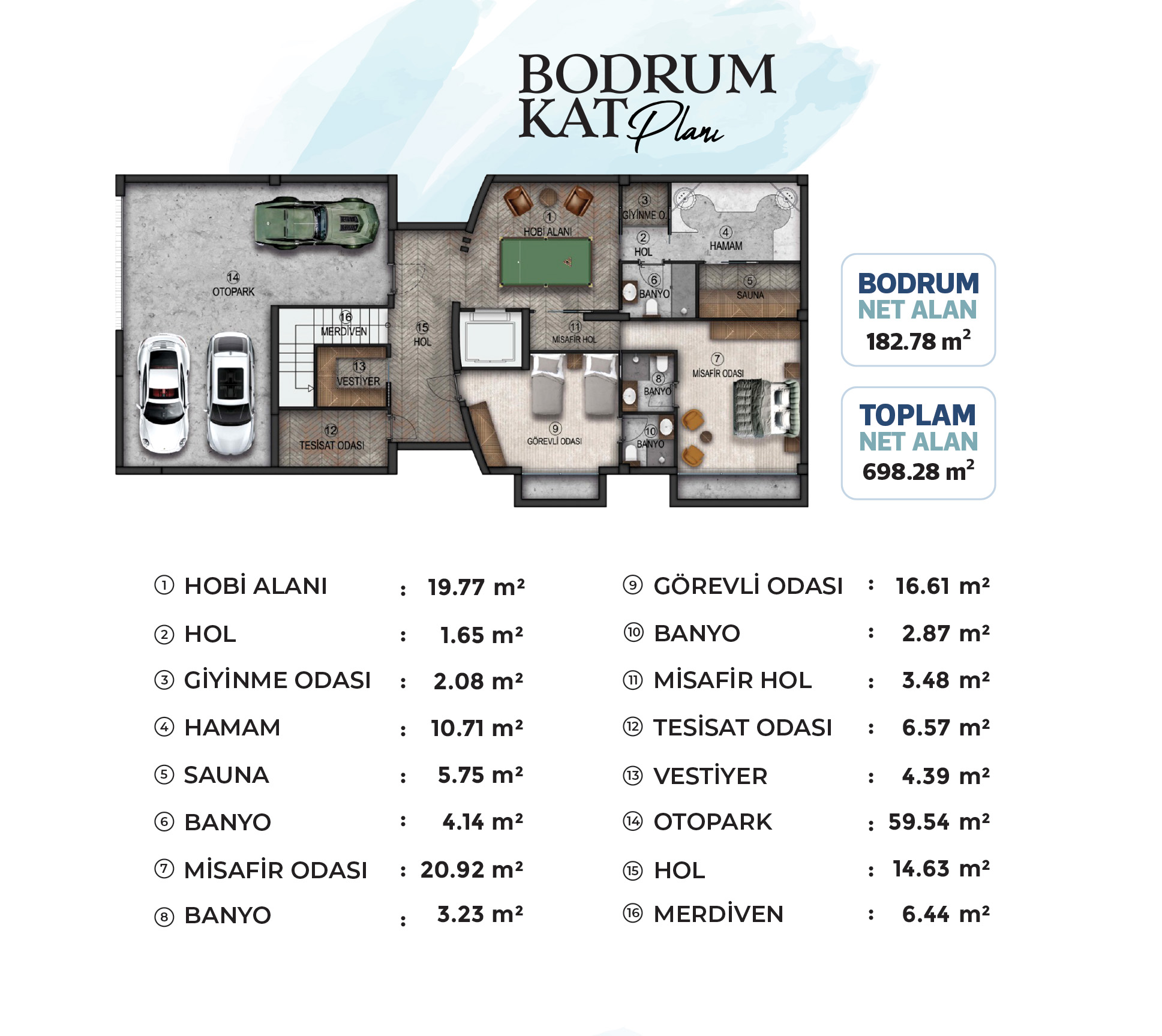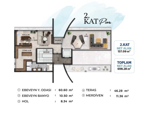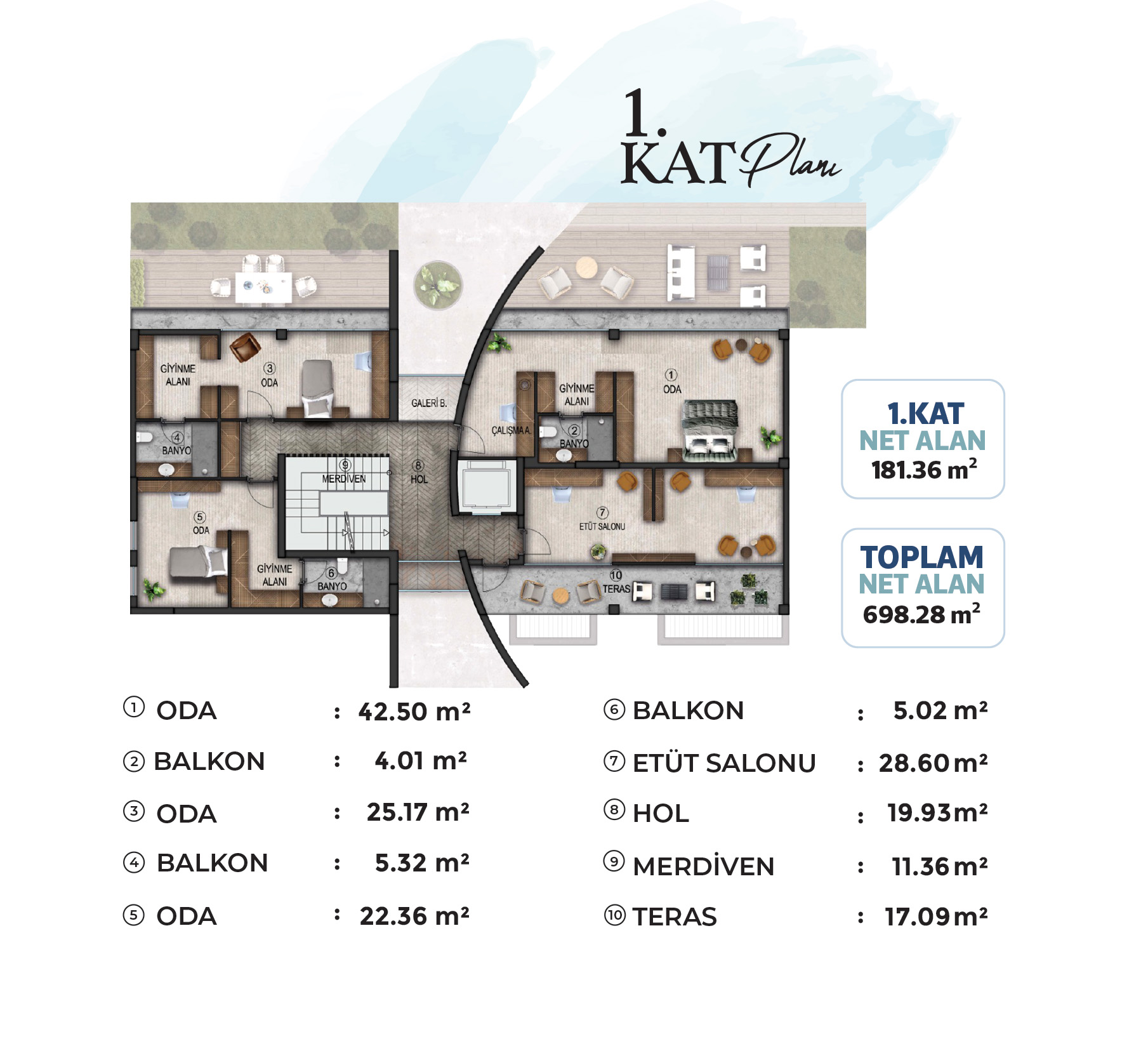 4 katlı ve asansörlü 3 adet villa kütlesinde ise lineer ve dairesel duvarlarla bölünerek, mimarisine farklı bir boyut kazandırılmıştır.